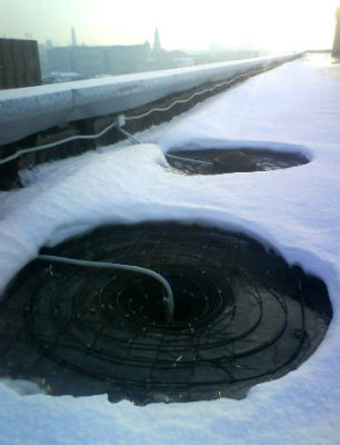 Как правило, заказчики заранее не задумываются о подогреве кровельных воронок и в результате оказываются перед непростым выбором: тянуть кабель или менять воронки. Так что лучше продумать обогрев системы водоотвода плоских и малоуклонных кровель заранее, еще на стадии проектирования.